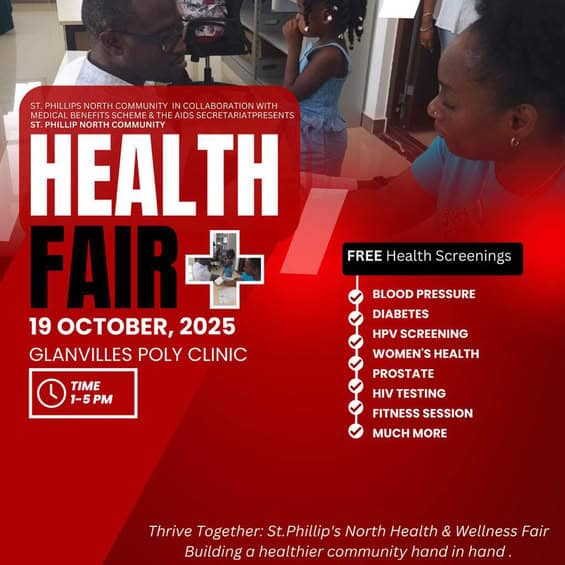 The St. Phillip’s North community is gearing up to host a comprehensive health fair on Sunday, 19 October 2025, at the Glanvilles Poly Clinic. The event, running from 1pm to 5pm, will offer free health screenings to residents, including blood pressure checks, diabetes testing, HPV screenings, women’s health evaluations, prostate exams, and HIV testing. In addition to the medical services, the fair will feature a fitness session and various wellness activities designed to promote a healthier lifestyle. Organisers have highlighted the event’s mission to enhance community well-being, encapsulated in the slogan, “Thrive Together: St. Phillip’s North Health & Wellness Fair – building a healthier community hand in hand.” The initiative is a collaborative effort involving the St. Phillip’s North community, the Medical Benefits Scheme, and the AIDS Secretariat. Residents are encouraged to attend and take full advantage of the resources and services provided. This event underscores the importance of accessible healthcare and community-driven wellness initiatives in fostering a healthier population.