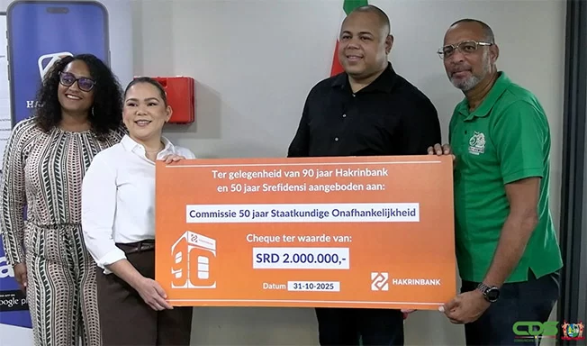 In a significant gesture of national pride and support, Hakrinbank NV has contributed SRD 2 million (approximately USD 50,000) to the Commission for the 50th Anniversary of Suriname’s Independence. The symbolic cheque was presented on Friday by Claire Wydh, the bank’s Deputy Director of Commerce, to Commission Chairman Klebert Drenthe. This donation underscores the bank’s commitment to Suriname’s development and its confidence in the nation’s future. Wydh emphasized that the contribution is not only a financial boost but also a symbolic nod to the country’s golden jubilee, with the amount reflecting the 50-year milestone. Hakrinbank, which will celebrate its 90th anniversary in June 2026, views this donation as a meaningful way to align its legacy with Suriname’s journey of growth and self-reliance. The bank highlighted that Suriname’s independence represents values of resilience, prosperity, and faith in local potential—principles that Hakrinbank itself champions. Wydh further noted that with nine decades of experience in the financial sector, the bank remains dedicated to fostering sustainable growth and community engagement. Drenthe expressed gratitude to Hakrinbank and other corporate contributors supporting the Srefidensi celebrations. The funds will be allocated to various cultural and educational initiatives, including the production of the Srefidensi song and video. A total of 50 events are planned throughout November to commemorate Suriname’s independence, with a national budget of SRD 65 million allocated for the festivities.