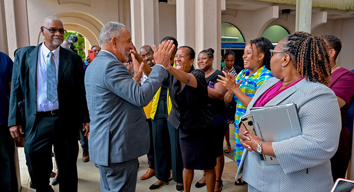 In a ceremonial transition of power, newly elected Prime Minister Godwin Friday received a warm reception from civil servants upon his arrival at the Administrative Complex in Kingstown on Monday. The historic moment marked his inaugural day at the Office of the Prime Minister following his party’s decisive electoral victory.