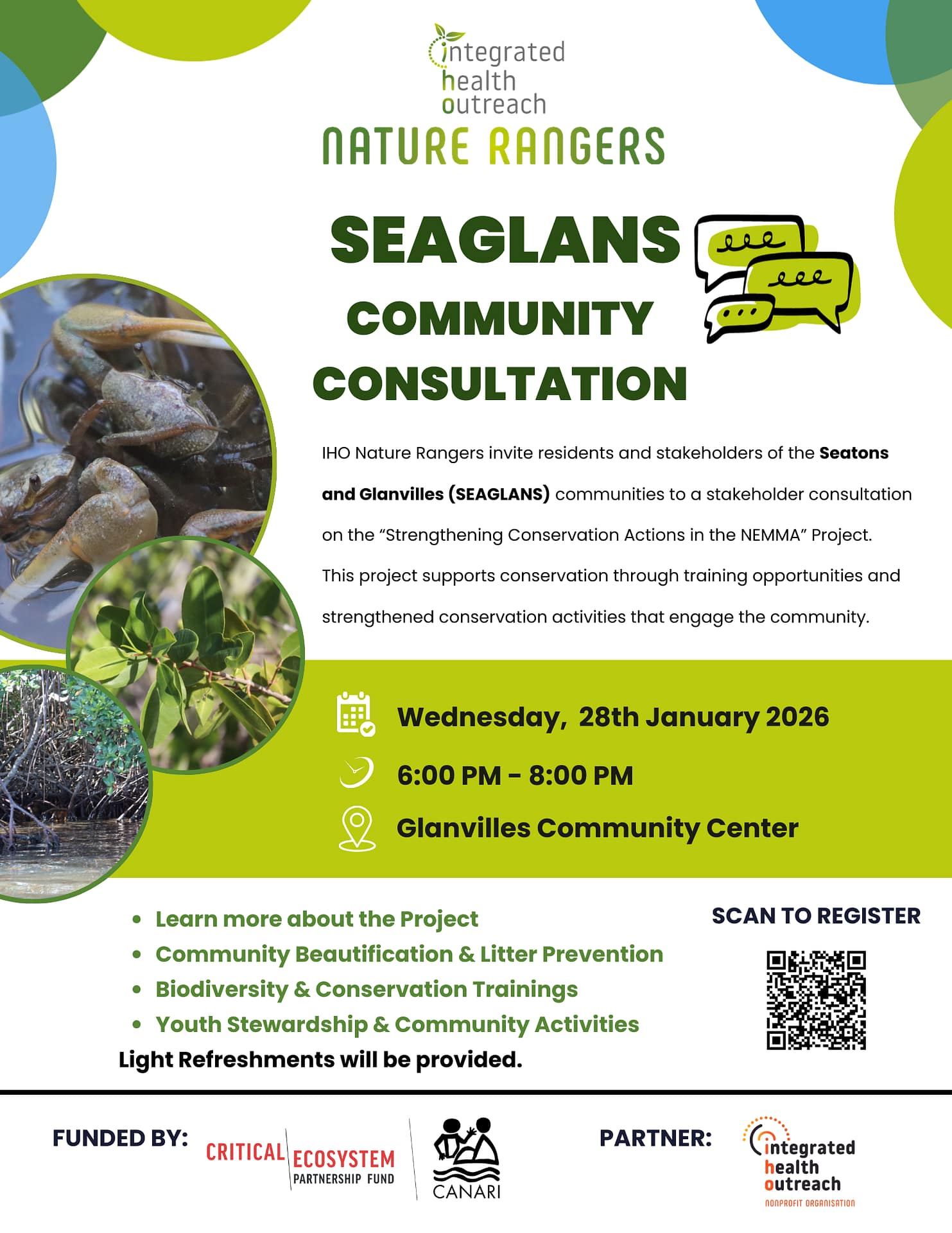 The project acknowledges the support of hosting venues Parham Primary School and Glanvilles Community Center. This initiative is implemented by IHO-Nature Rangers with funding from the Critical Ecosystem Partnership Fund and World Bank, supported by the Caribbean Natural Resources Institute and partner organization Integrated Health Outreach.