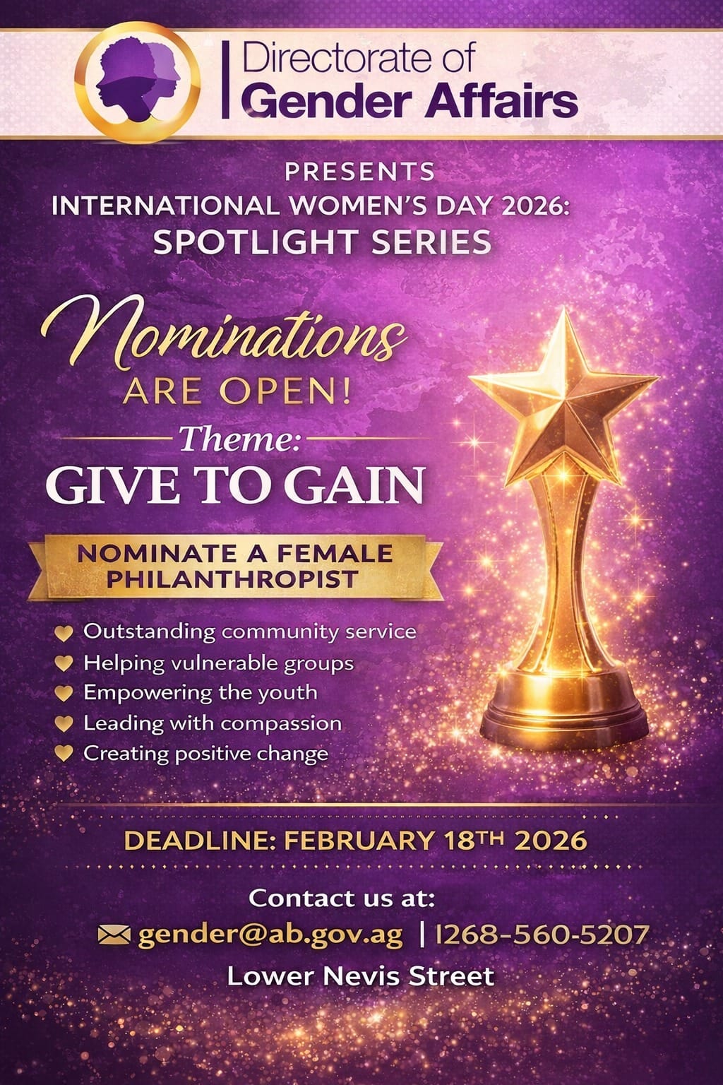 The Directorate of Gender Affairs in Antigua and Barbuda has officially commenced the nomination period for its 2026 International Women’s Day Spotlight Series, a distinctive program dedicated to celebrating female philanthropists whose modest yet impactful contributions have substantially fortified community foundations nationwide.