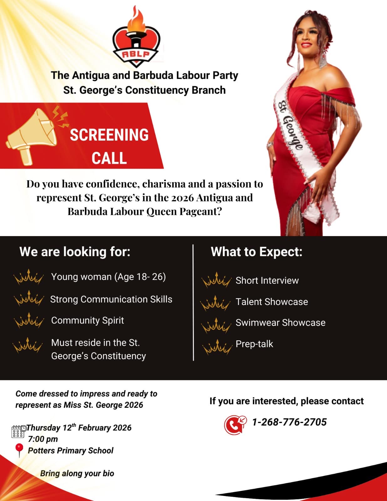 The St. George’s Constituency Branch of the Antigua and Barbuda Labour Party has initiated its selection process for the upcoming 2026 Labour Queen Pageant, marking the beginning of preparations for the national event. Community organizers are actively seeking accomplished young women from the St. George’s area to compete for the prestigious Miss St. George 2026 title, which serves as the constituency’s official representation in the national competition.