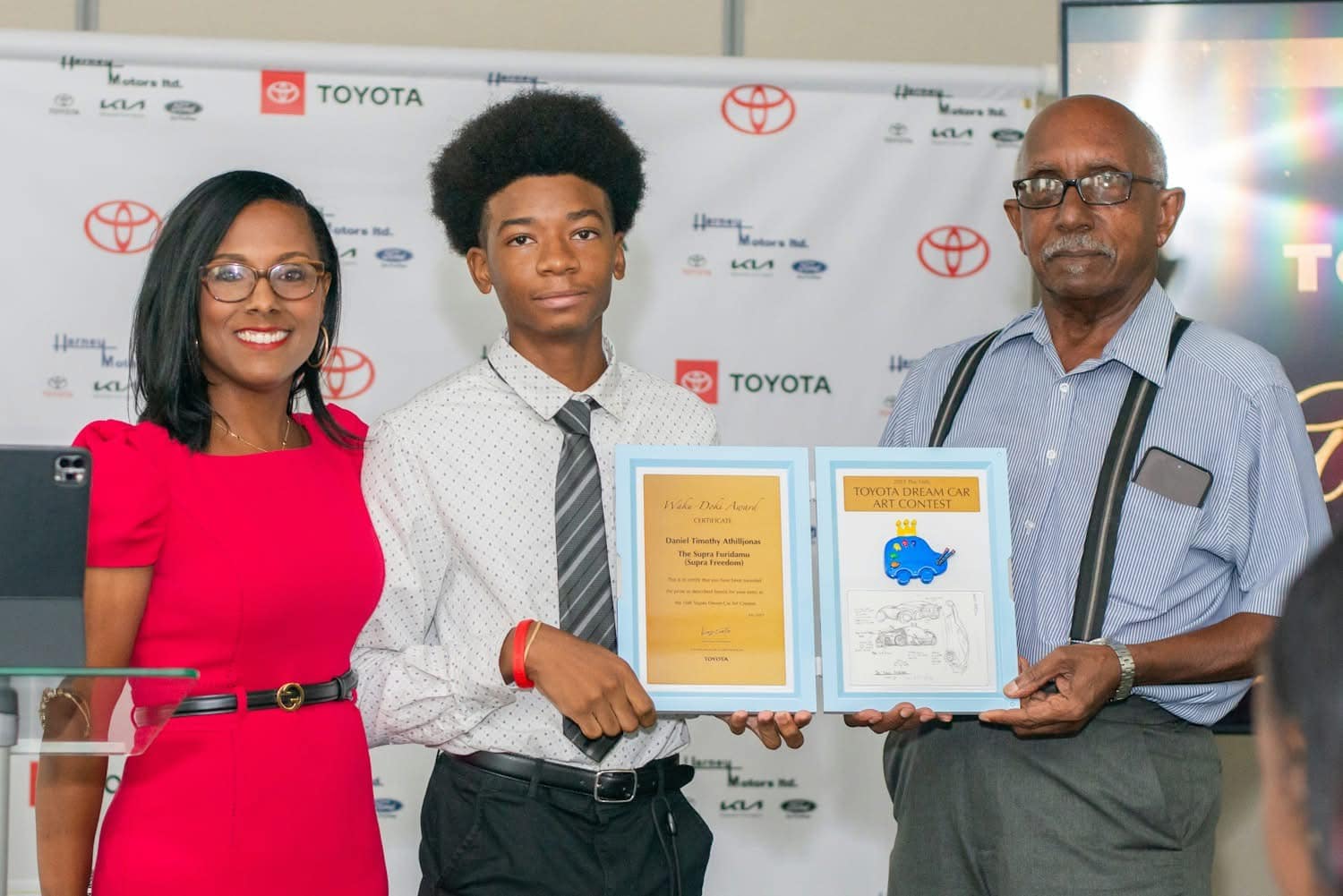 The Toyota Dream Car Art Contest represents a global initiative that challenges children worldwide to conceptualize and create visionary vehicle designs, fostering artistic talent and innovative perspectives on future transportation solutions. Documented photographs released by Harney Motors capture the memorable moment when Athill-Jonas, accompanied by Mrs. Harney Barnes and Mr. Harney, displayed his official plaque from Toyota Motor Corporation during a special recognition ceremony held in his honor.