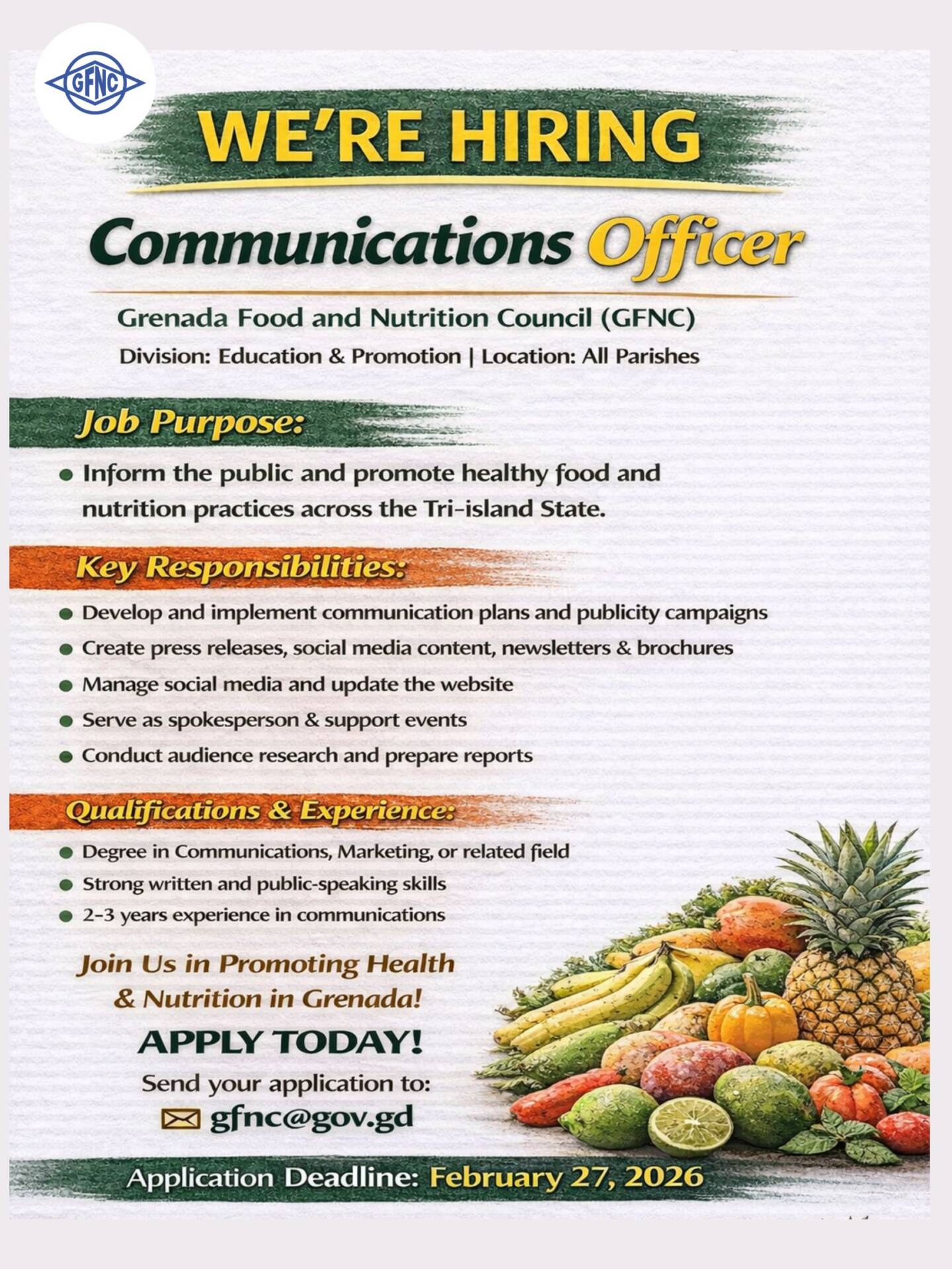 The Grenada Food and Nutrition Council (GFNC) has announced an employment opportunity for a Communications Officer to spearhead public education campaigns promoting healthy nutritional practices throughout the tri-island nation. This strategic position within the Education & Promotion Division will be instrumental in shaping public health messaging across all parishes.