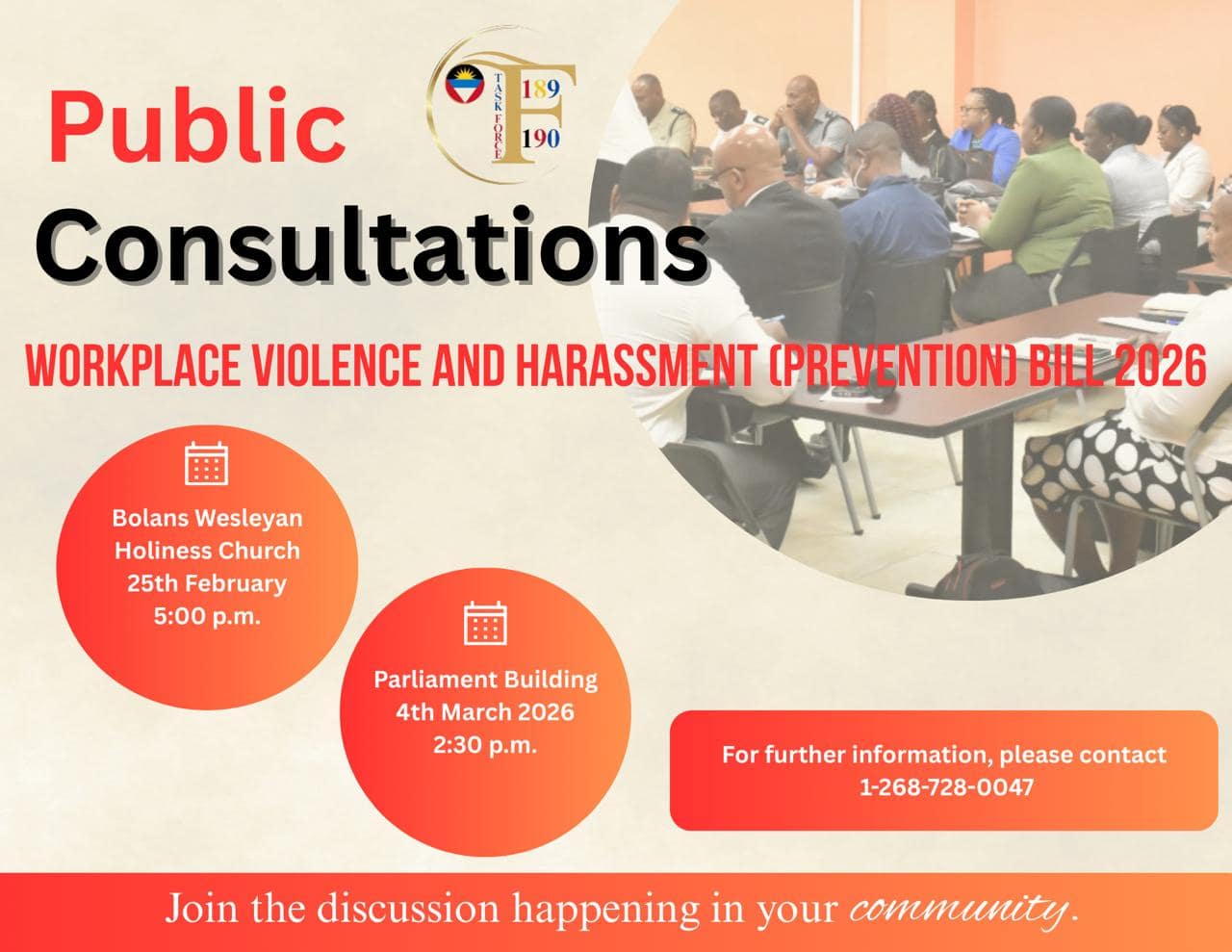The government of Antigua and Barbuda has initiated a crucial phase of public engagement for its proposed Workplace Violence and Harassment (Prevention) Bill 2026, scheduling consultation sessions to gather vital stakeholder input. These forums, designed to incorporate diverse perspectives before legislative advancement, will convene on two separate dates: February 25th at 5:00 PM at the Bolans Wesleyan Holiness Church, followed by a second session on March 4th at 2:30 PM within the Parliament Building in St. John’s.